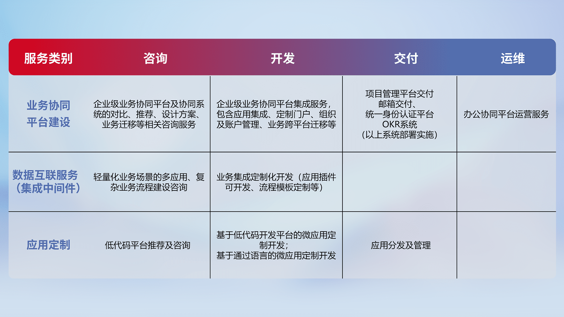 针对钉钉、、、企微、、IDaas等平台级产品提供产品的规划、、、、方案、、交付、、、、定制化开发等服务,,,实现如统一协同办公、、智能客户服务、、混合会议管理、、、智能数据查询、、等业务场景,,,,实现数字化转型。。。