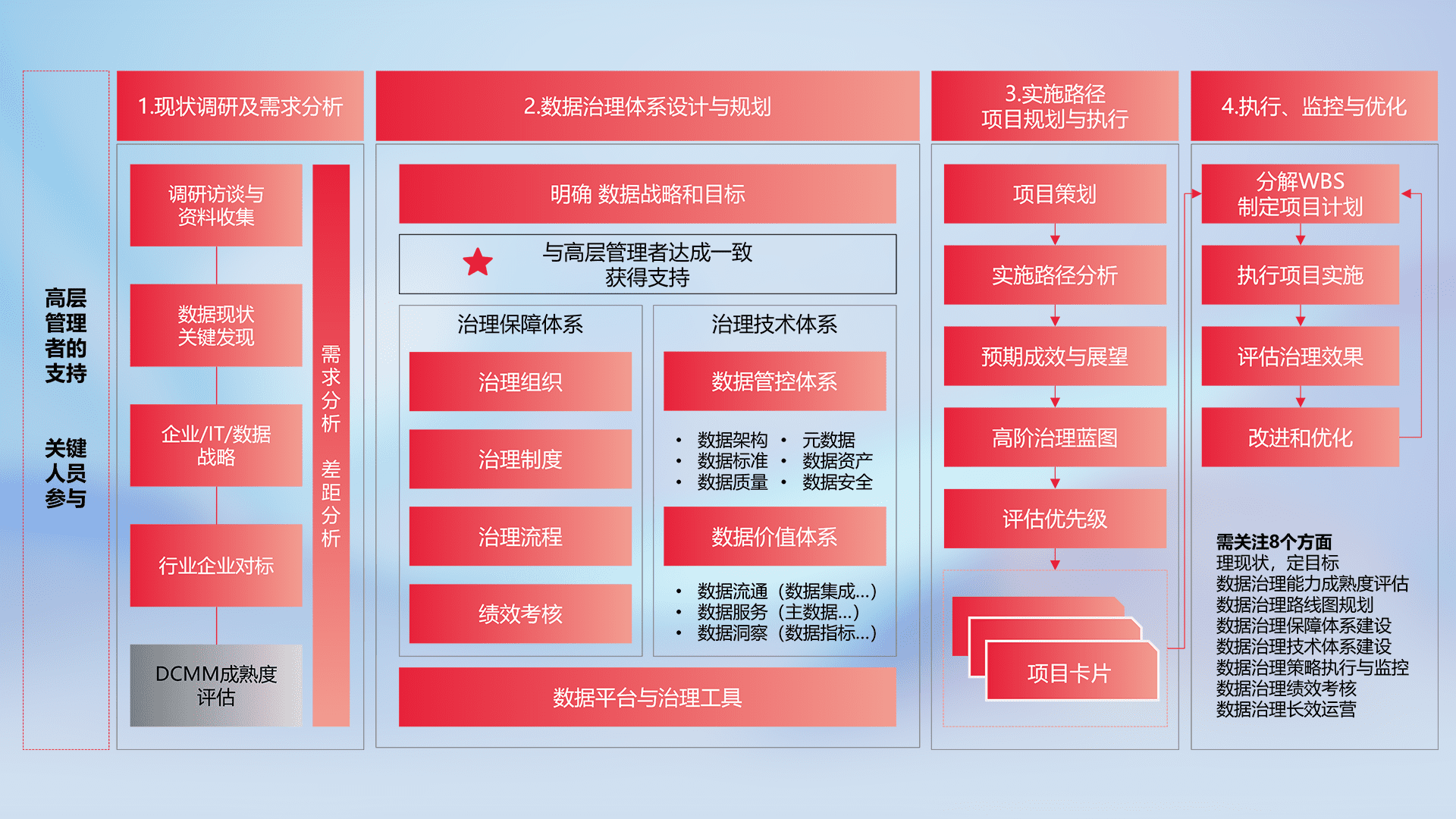制定并执行统一的数据标准,,,规范数据定义和格式,,,,消除冗余和不一致性,,实现跨部门和跨系统的数据一致性,,,为企业提供标准化的数据基础。。